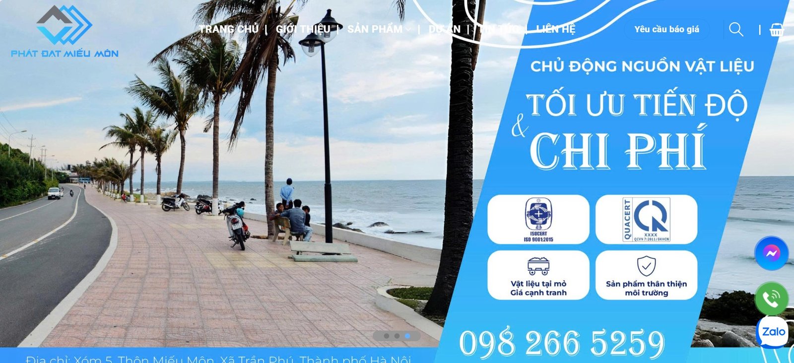 Website được thiết kế với tông màu xanh dương chủ đạo, thể hiện sự tin cậy, uy tín và tính bền vững, đúng tinh thần thương hiệu “Chất lượng tạo dựng niềm tin” của Phát Đạt Miếu Môn.