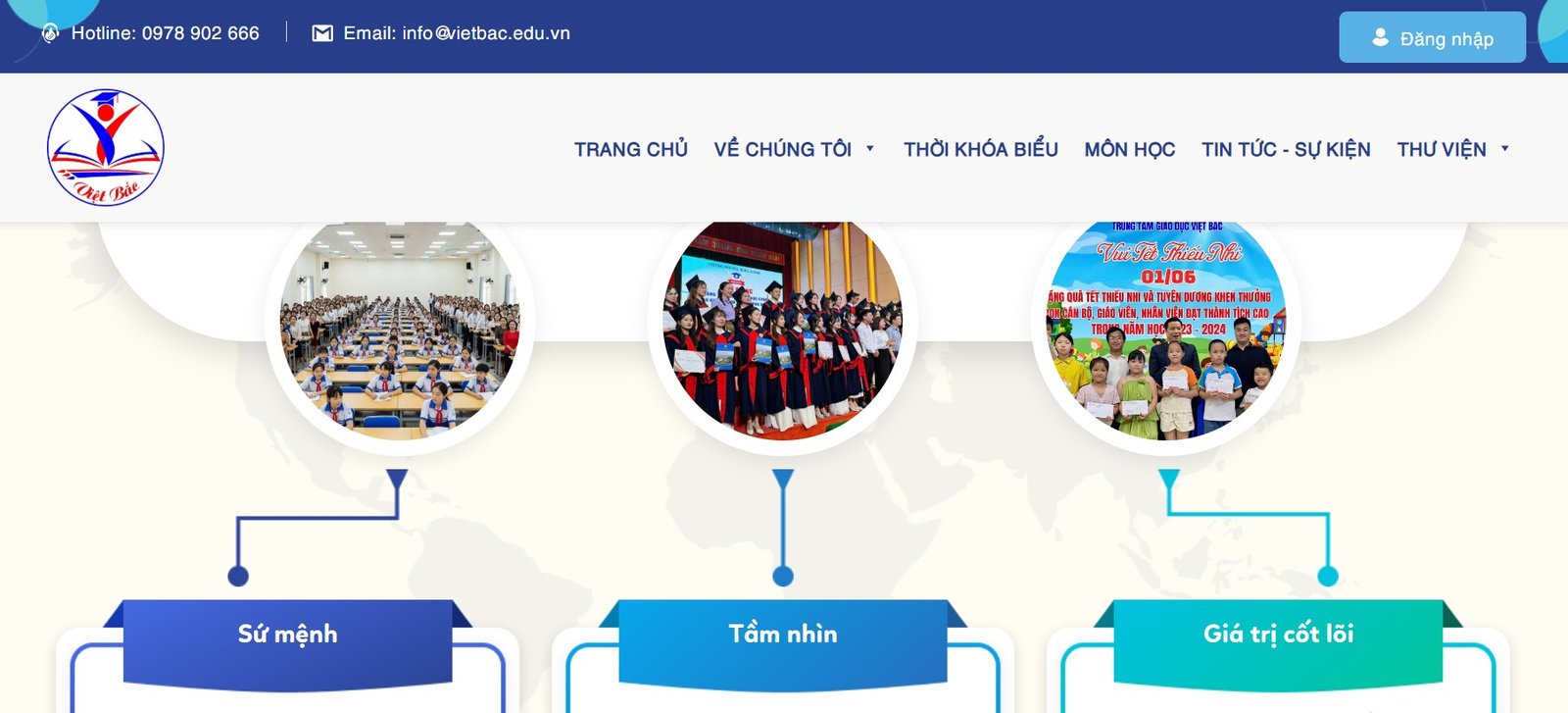 Với tầm nhìn và sứ mệnh đầy nhân văn ấy, Việt Bắc luôn chú trọng tạo dựng hình ảnh chuyên nghiệp, đồng thời mang đến cho học sinh và phụ huynh một kênh kết nối nhanh chóng, thuận tiện.